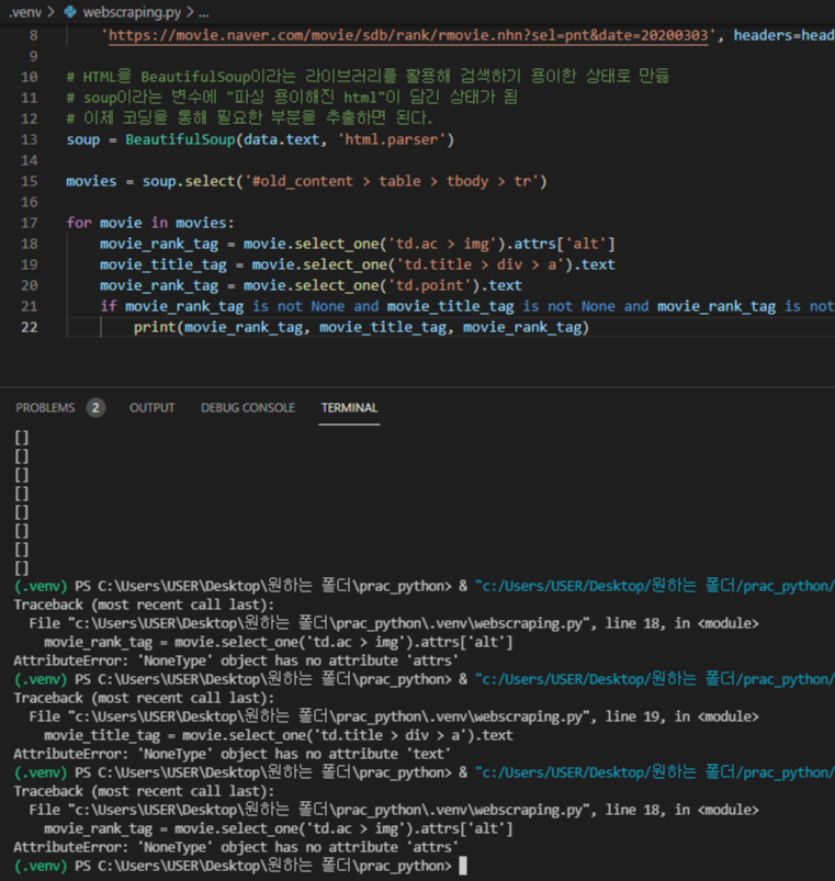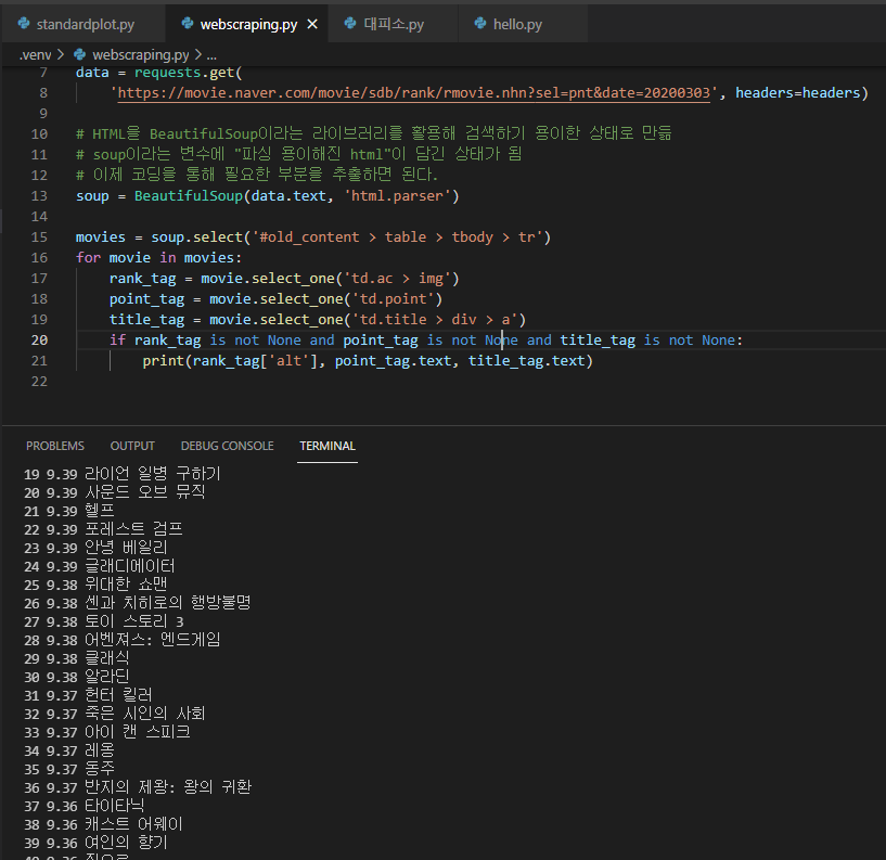 네이버 영화 html에서 각 영화의 순위, 제목, 평점을 한 데 묶어서 크로울링하는 작업이었다.